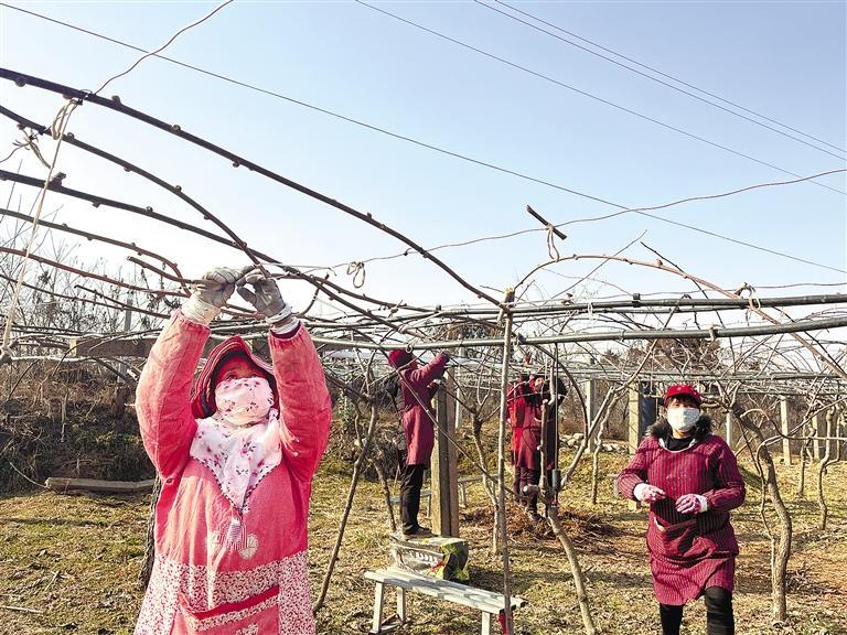 2月21日,杜列让(左一)在给猕猴桃绑枝。 本报记者 张佳仪摄
