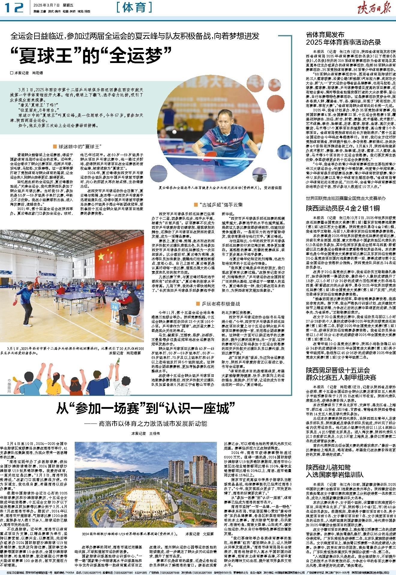2025年,我省计划承办、举办35项竞技体育赛事,包括国际赛事4项、全国赛事22项、十五运会资格赛9项,覆盖花样游泳、田径、射击、射箭、赛艇、武术套路、武术散打、艺术体操、拳击、跆拳道、足球、篮球、排球、垒球、高尔夫球、攀岩、马术等17个夏季项目和越野滑雪、高山滑雪2个冬季项目。省体育局竞技体育处处长方晓刚表示:“第十五届全国运动会今年将在粤港澳举行。目前,我们全方位对标竞技体育强省,按照提升能力、争夺资格、赛前强化、决战决赛4个阶段有序推进备战工作。3月至9月,陕西将相继承办武术散打、赛艇、拳击、跆拳道、足球、篮球、三人篮球、垒球、马术等9个项目的十五运会资格赛。我们要发挥主场优势,争取获得更多的十五运会决赛资格。”