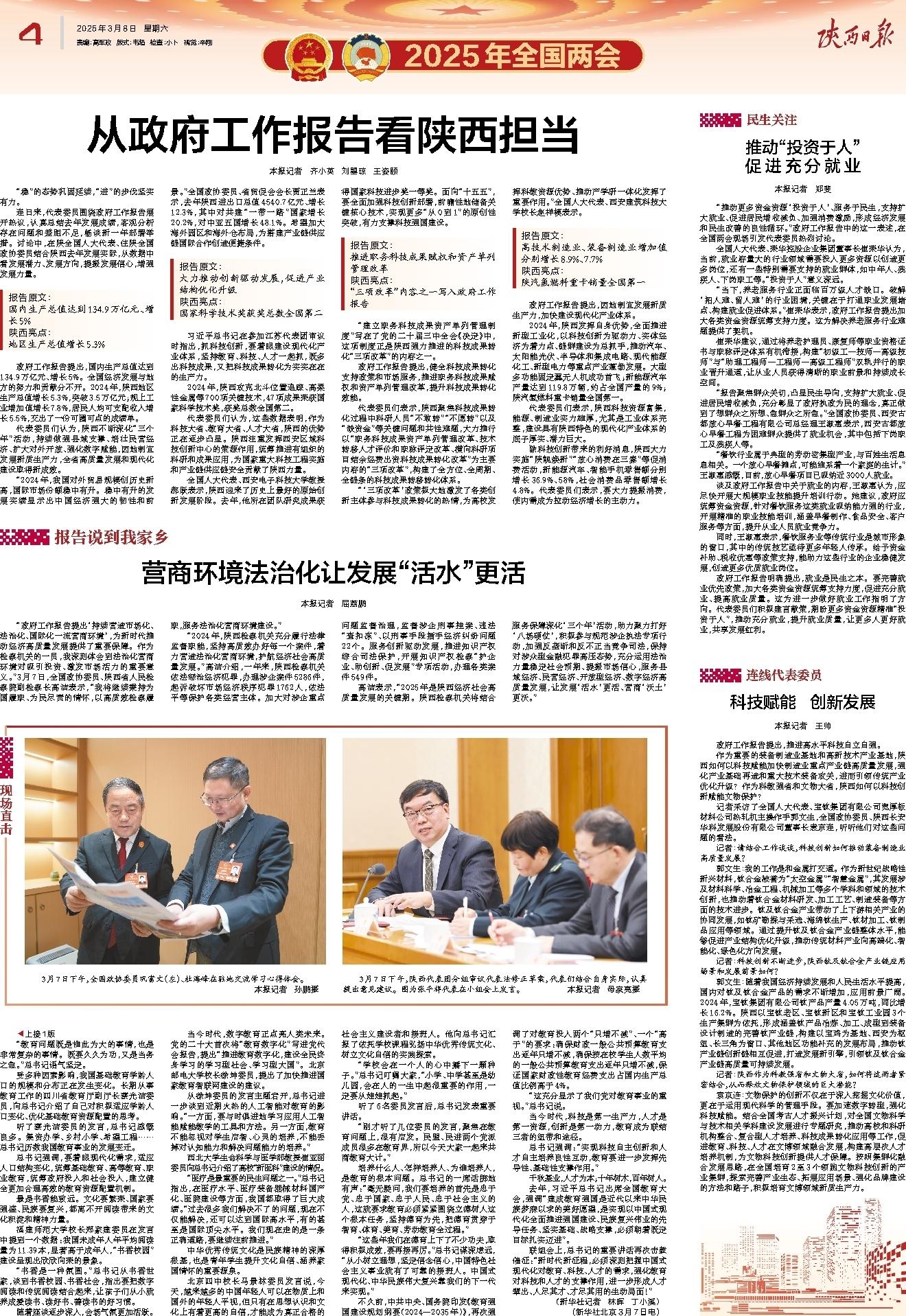 代表委员们认为,陕西不断深化“三个年”活动,持续做强县域支撑、培壮民营经济、扩大对外开放、强化数字赋能,因地制宜发展新质生产力,全省高质量发展和现代化建设取得新成效。