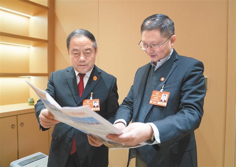 3月7日下午,全国政协委员巩富文(左)、杜海峰在驻地交流学习心得体会。 本报记者 孙鹏摄