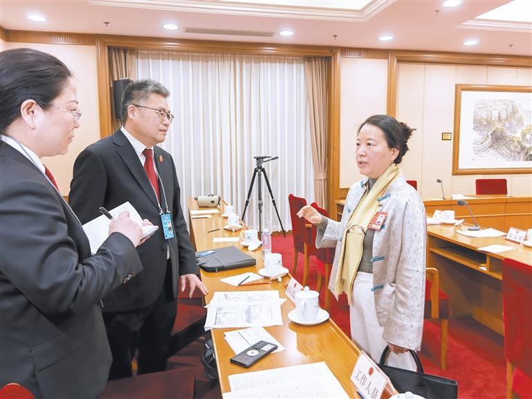 3月9日,陕西代表团分组审议“两高”工作报告。会后,方兰代表(右)与到会听取意见的最高人民法院工作人员,围绕民生保障、未成年人保护等主题进行交流研讨。 本报记者 母家亮摄