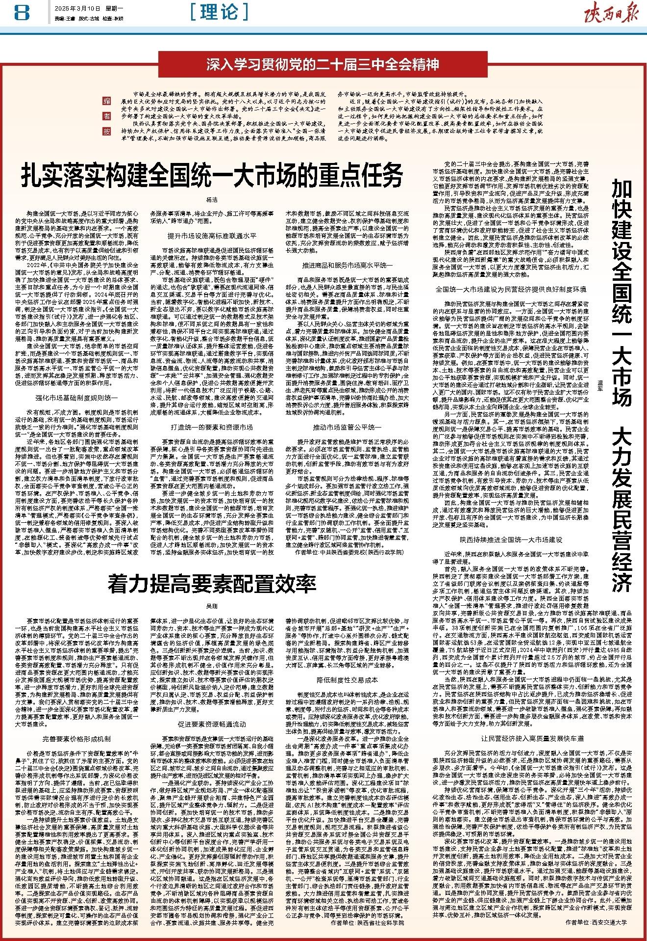 充分发挥民营经济的活力与创造力,深度融入全国统一大市场,不仅是实现陕西经济转型升级的必然要求,还是推动区域协调发展的重要路径,需要从多层次、多方面着手。今年初,《全国统一大市场建设指引(试行)》发布。这是推动全国统一大市场建设走深走实的务实举措,必将加快全国统一大市场建设,进一步激发民营经济活力,推动民营经济在高质量发展快车道上稳步前行。