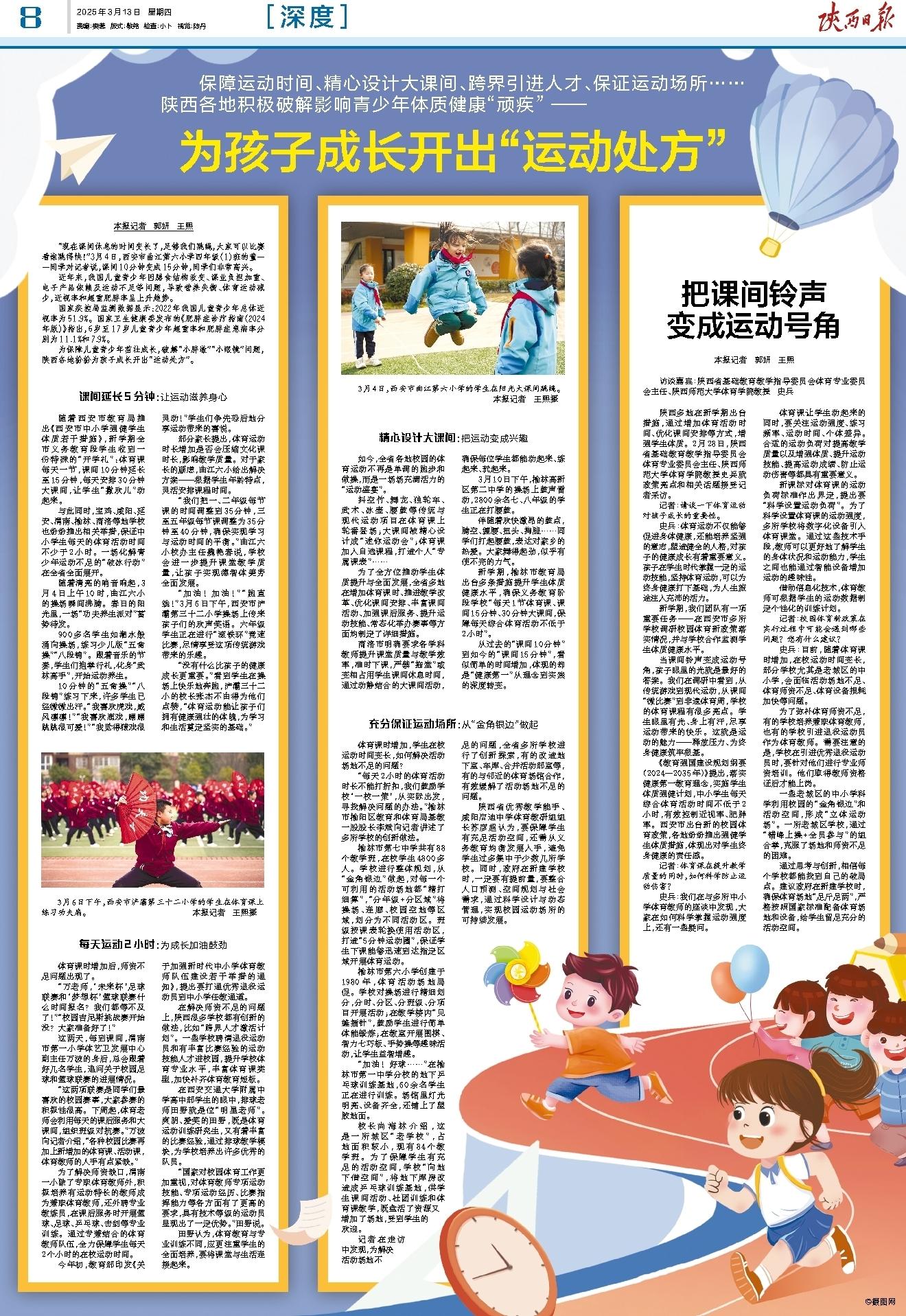 与此同时,宝鸡、咸阳、延安、渭南、榆林、商洛等地学校也纷纷推出相关举措,保证中小学生每天的体育活动时间不少于2小时。一场化解青少年运动不足的“破冰行动”在全省全面展开。