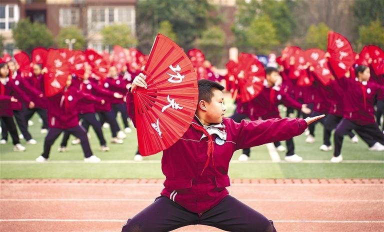 900多名学生如潮水般涌向操场,练习少儿版“五禽操”“八段锦”。跟着音乐的节奏,学生们抱拳行礼,化身“武林高手”,开始运动养生。