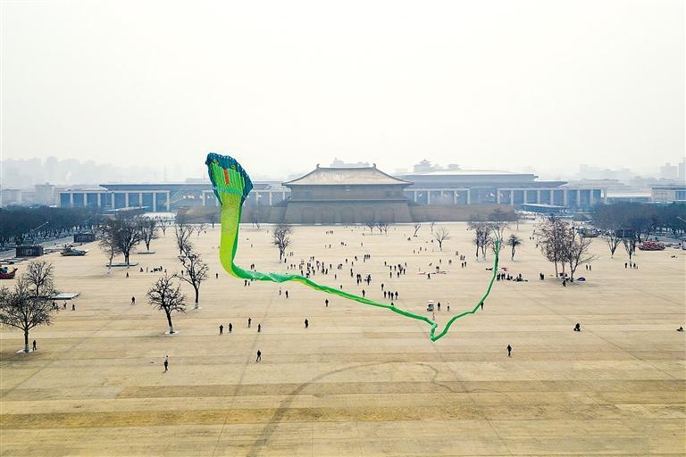 3月8日,风筝爱好者在大明宫国家遗址公园丹凤门广场放飞巨型“青蛇”风筝。 受访者供图