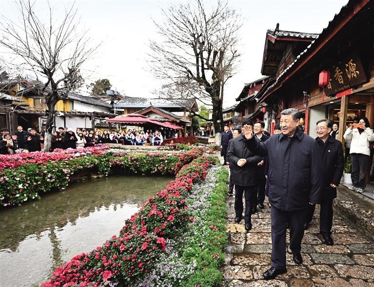 丽江古城有800多年历史,被列入世界文化遗产名录。一场春雪过后,丽江游人如织。习近平来到这里,详细了解古城营建历史、纳西族民居特色和当地文化遗产保护利用、推动文旅融合发展等情况。居民和游客见到总书记十分兴奋,争相问好,有的还弹奏乐器、载歌载舞欢迎总书记。习近平频频与大家互动交流,了解商铺经营状况和游客感受。他要求当地处理好保护和发展的关系,让这座美丽的古城焕发新的光彩。
