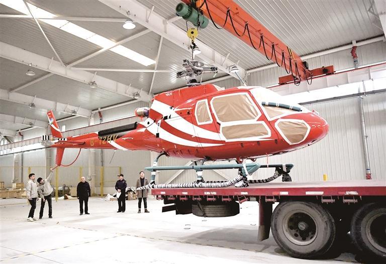 西安航空基地综合保税区工作人员正在搬运直升机。