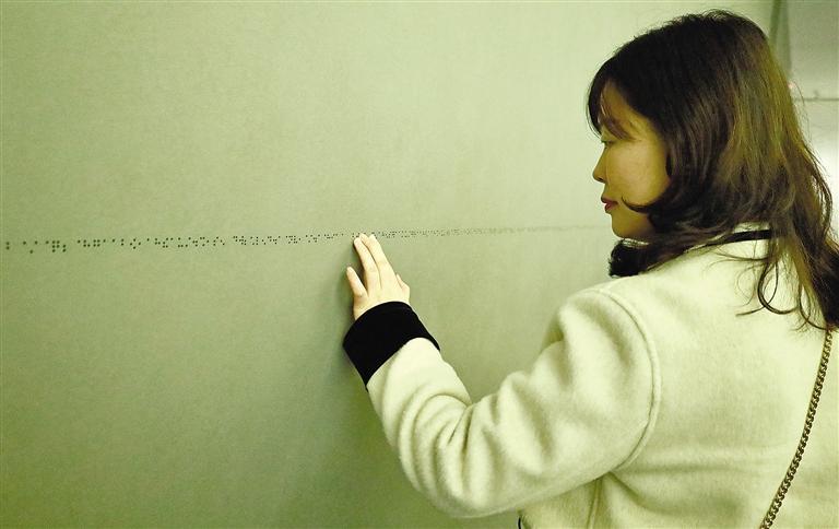 3月14日,游客触摸陕历博秦汉馆墙壁上的盲文。 本报记者 赵茁轶摄