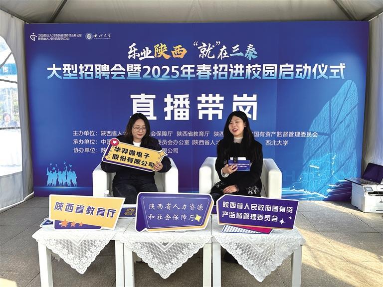 “各位观众朋友,我给大家介绍一下我们公司今年招聘的岗位信息。公司招的主要是销售工程师,理工科类的专业都可以报名。”3月13日,在“乐业陕西 ‘就’在三秦”大型招聘会暨2025年春招进校园启动仪式现场,来自华羿微电子股份有限公司的工作人员在直播带岗区域向观众介绍公司招聘信息。