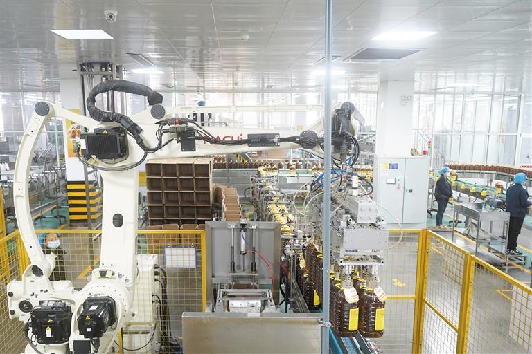 3月24日,在西安鲁花食用油有限公司车间,包装智能生产线高速运转,机械臂精准地将一桶桶油装箱。 本报记者 李妮摄