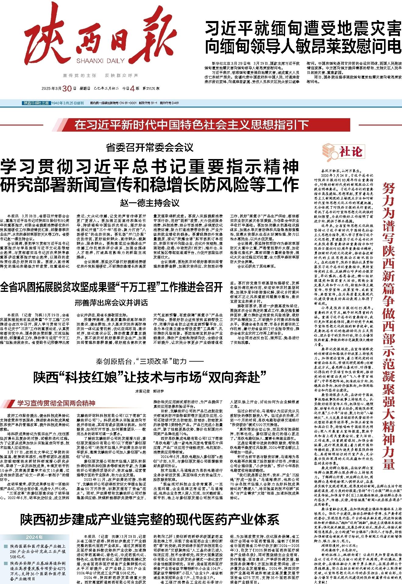 本报讯 3月28日,省委召开常委会会议,重温习近平总书记对陕西日报创刊80周年的重要指示,听取全省提振消费硬仗和外贸拓展硬仗工作推进情况汇报,部署春季农业生产、水利和森林草原防灭火等工作。省委书记赵一德主持会议。