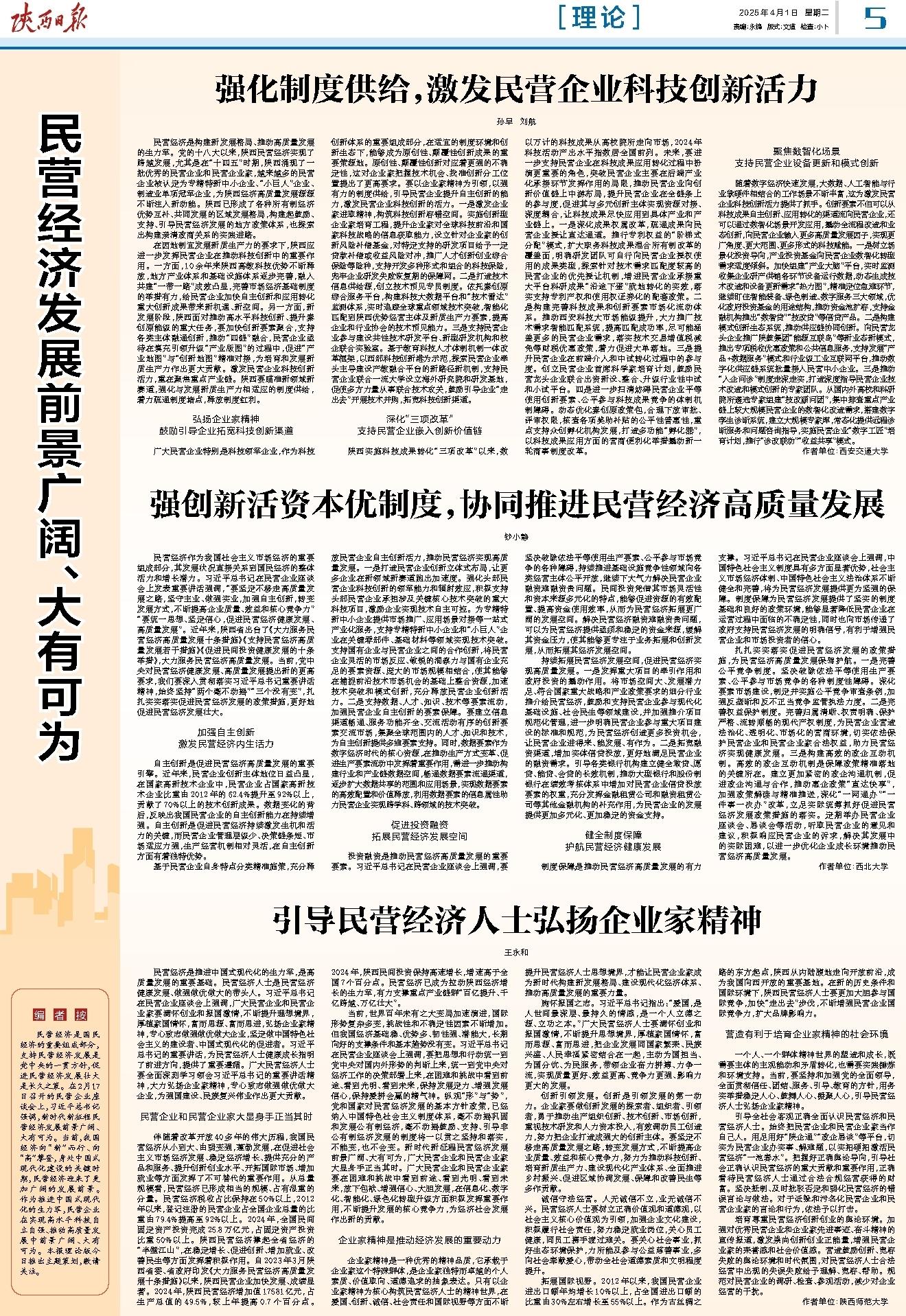 伴随着改革开放40多年的伟大历程,我国民营经济从小到大、由弱变强,蓬勃发展,在促进社会主义市场经济发展、稳定经济增长、提供充分的产品和服务、提升创新创业水平、开拓国际市场、增加就业等方面发挥了不可替代的重要作用。从总量规模看,民营经济已形成相当的规模、占有很重的分量。民营经济税收占比保持在50%以上,2012年以来,登记注册的民营企业占全国企业总量的比重由79.4%提高至92%以上。2024年,全国民间固定资产投资完成25.8万亿元,占固定资产投资比重50%以上。陕西民营经济撑起全省经济的“半壁江山”,在稳定增长、促进创新、增加就业、改善民生等方面发挥着积极作用。自2023年3月陕西省委、省政府印发《大力服务民营经济高质量发展十条措施》以来,陕西民营企业加快发展、成绩显著。2024年,陕西民营经济增加值17581亿元,占生产总值的49.5%,较上年提高0.7个百分点。2024年,陕西民间投资保持高速增长,增速高于全国7个百分点。民营经济已成为拉动陕西经济增长的生力军,有力支撑重点产业链群“百亿提升、千亿跨越、万亿壮大”。