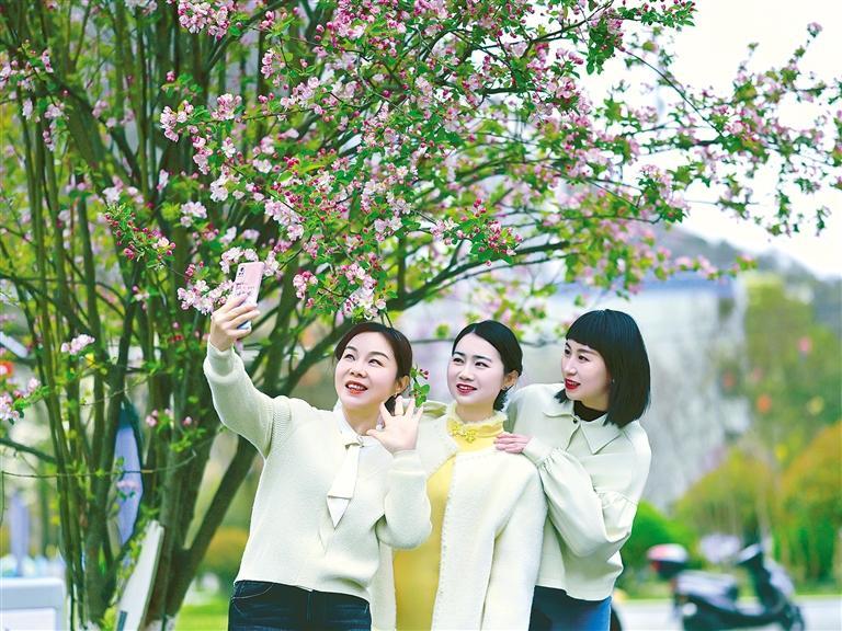 3月28日,宁陕县城关镇滨河公园内海棠花盛放,引得游客争相拍照。
