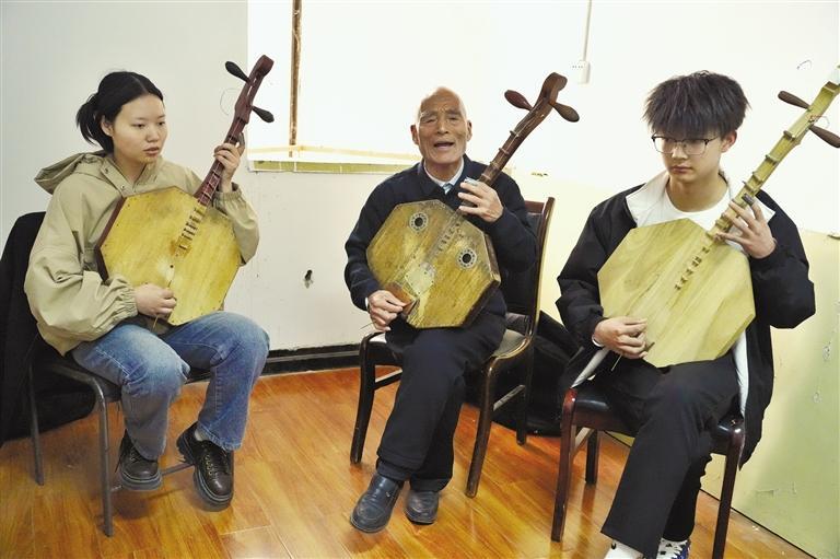 3月27日,在渭南市华州区剧团的排练室,吕崇德(中)在教学生弹奏月琴。