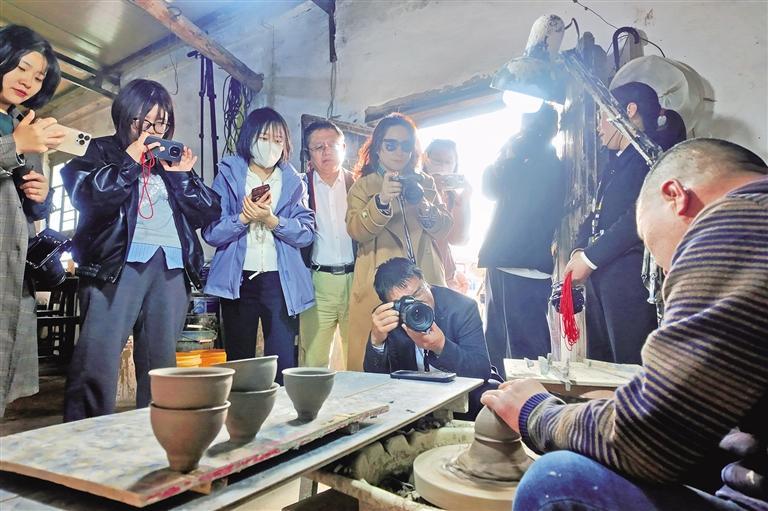 4月1日,2025年“同根祭初祖,同心筑梦圆”境外媒体采访团在澄城县尧头窑文化旅游生态园区观看尧头陶瓷烧制技艺非遗传承人演示拉坯工艺。