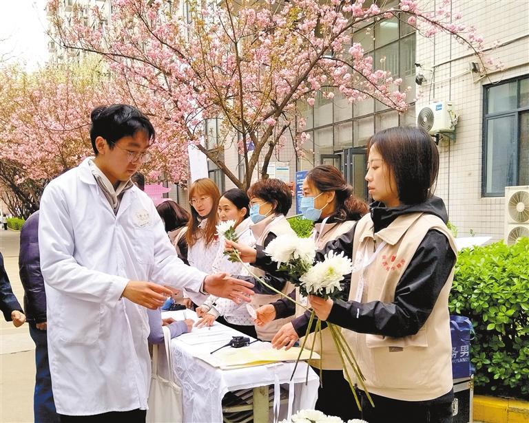 三月二十九日,在西安交通大学医学部,工作人员向活动参与者分发鲜花。
