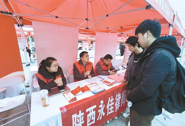 此次招聘会首次设置劳动法律监督服务岗亭,陕西永佳律师事务所6名公益律师,现场为求职者答疑解惑。