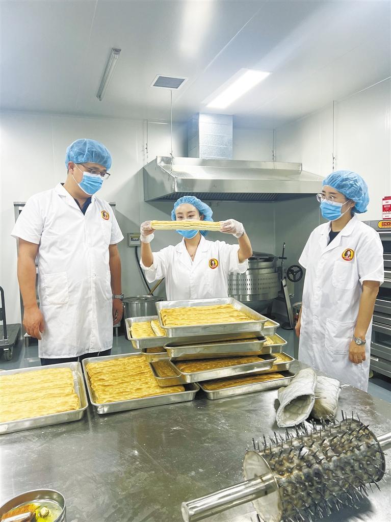 3月25日,王婷(中)在厂房检查锅盔的硬度。 本报通讯员 郑晨摄