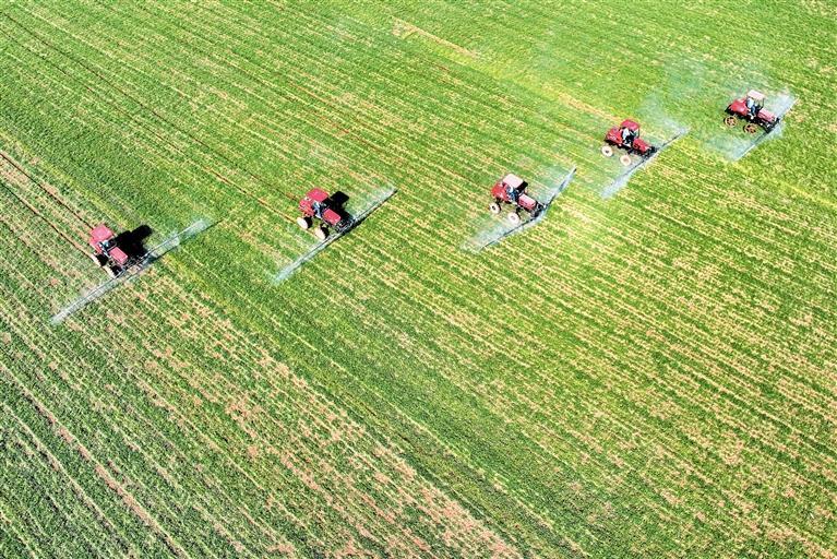 在西安市长安区引镇街道赵家坡常村,长安区长丰农机专业合作社的自走式高杆喷雾机在对该村的1800亩麦田进行化学除草作业(资料照片)。 本报记者 许奥博摄