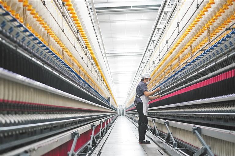 4月5日,工人在江苏泰达纺织科技有限公司智慧化纺纱工厂作业。 新华社记者 季春鹏摄