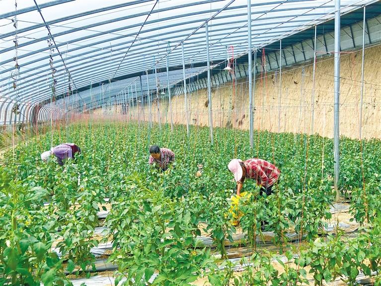 三月二十六日上午,淳化县铁王镇小池村北塬现代农业示范园里,村民在采摘辣椒。 本报记者 屈荔鹏摄
