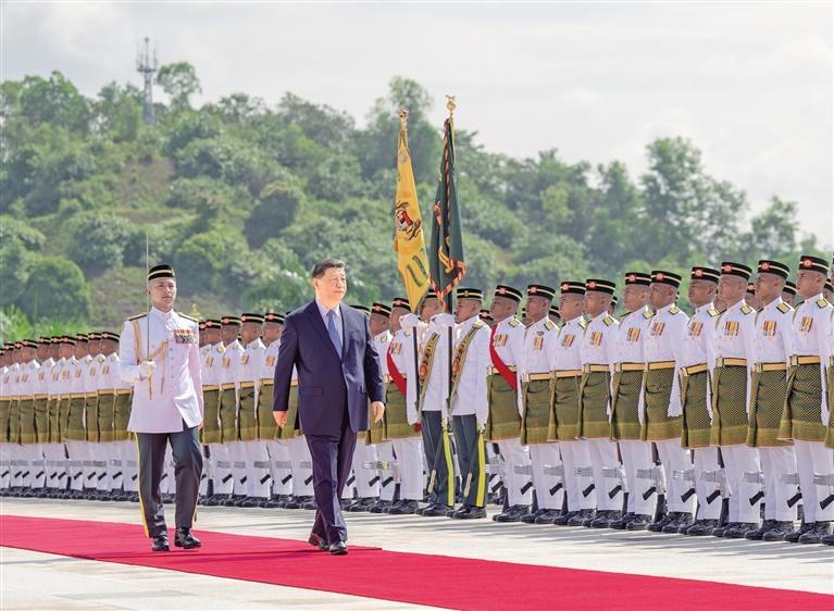 习近平乘车抵达时,易卜拉欣和马来西亚总理安瓦尔在下车处热情迎接。两国元首登上检阅台,军乐团奏中马两国国歌,鸣礼炮21响。习近平检阅仪仗队。两国元首进入国家王宫大厅,同双方陪同人员握手致意。