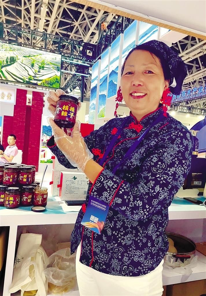 何军参加展会,推介核桃辣子酱。 受访者供图