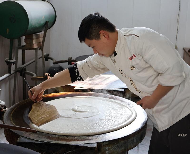 摊面用的是特制的铁鏊,重20多公斤,直径约90厘米。舀一勺面糊倒在铁鏊中心,用半月形的木踅子向外围慢慢推开,再从外向内旋转抹匀,摊成一张厚度2毫米左右的面饼。等到面饼的一面变硬,就将其转移至另一个铁鏊上烙,烙到七八成熟时,揭起晾在阴凉处。待面饼温度下降,就将其转移至通风处,让表面迅速风干、锁住水分。这就是踅面筋道的秘诀。