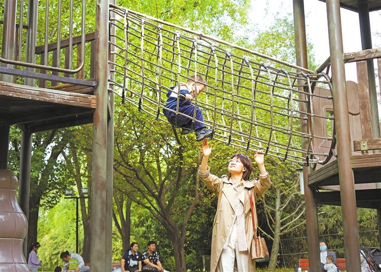 4月13日,在唐城墙遗址公园的儿童活动区,家长带着孩子玩耍,享受户外亲子时光。 本报记者 田芳昕摄