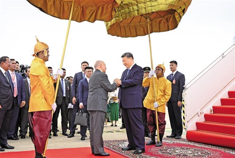 习近平乘专机抵达金边国际机场时,西哈莫尼国王率夏卡朋亲王、阿伦公主等王室成员,人民党主席、参议院主席洪森,国会第一副主席钱业以及郭索帕、布拉索昆、韩春那洛、韶索卡、洪玛尼等五位副首相在机场热情迎接。礼兵分列红毯两侧。柬埔寨王室珍娜公主向习近平献上茉莉花手环,女青年沿途向红地毯抛撒花瓣。