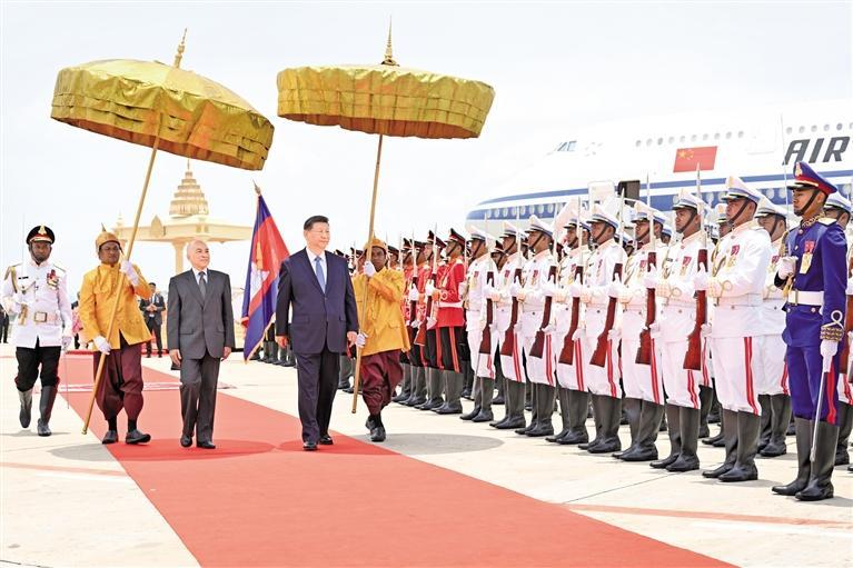 两国元首登上检阅台。军乐团奏中柬两国国歌。习近平在西哈莫尼陪同下检阅仪仗队。两国元首分别同对方陪同人员握手致意。