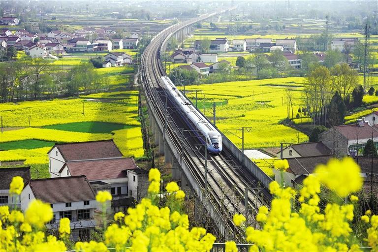 4月8日,在汉中市南郑区新集镇岳岭村,飞驰的列车驶过油菜花海。