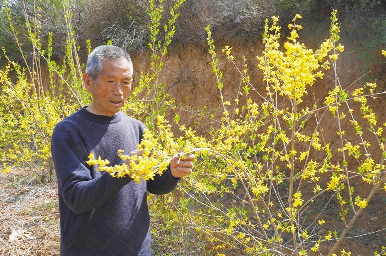 这片连翘林是山长河村村民陈学选管理的。4月8日一大早,陈学选就上山查看连翘长势。“管护连翘林不累,平时只需除草、修剪枝条,到丰收时雇人采摘即可。”陈学选说,“多亏了宜君县蚂蚁森林连翘栽植项目,去年,连翘林让我获得了十几万元的收益。”