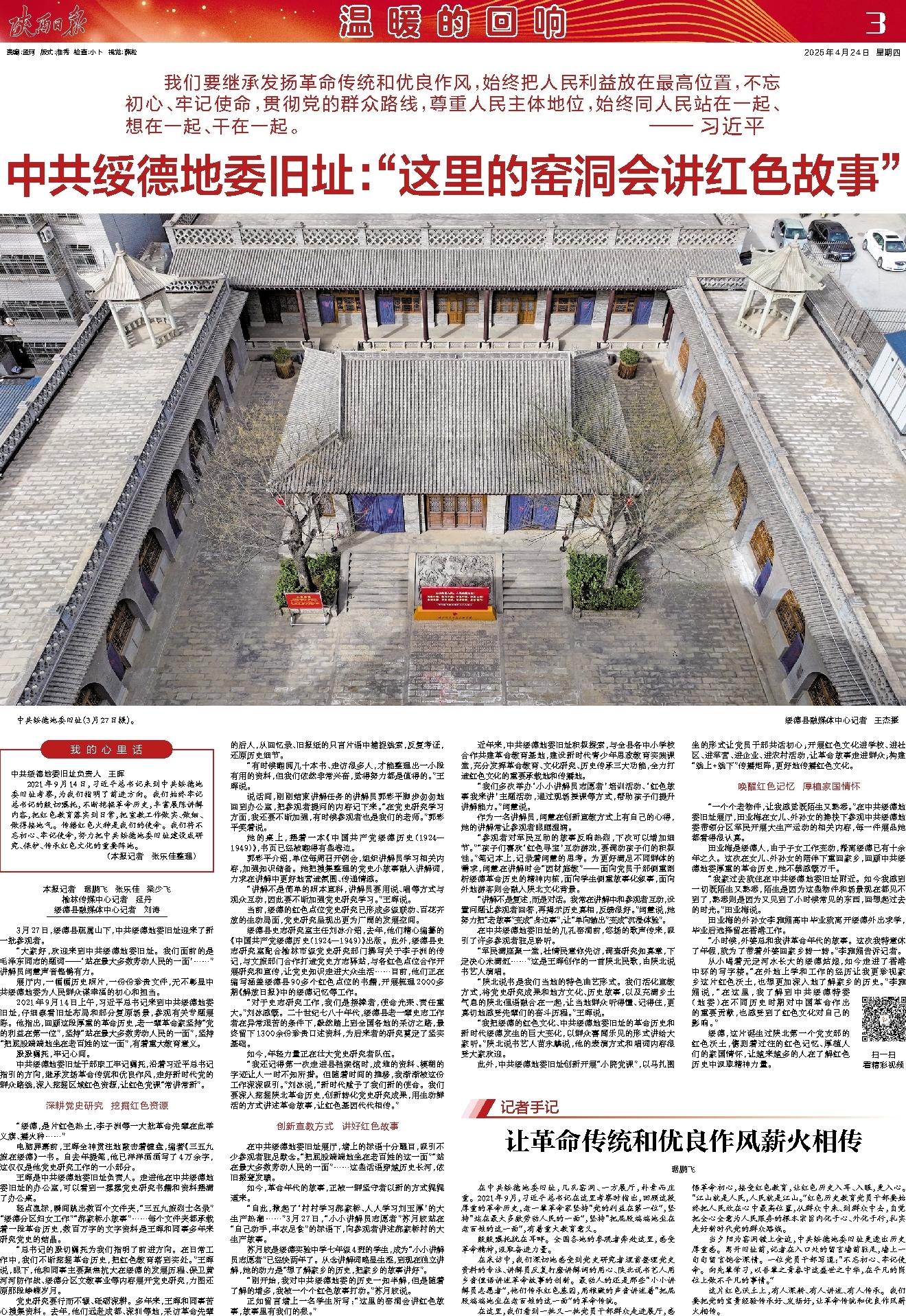 2021年9月14日,习近平总书记来到中共绥德地委旧址考察,为我们指明了前进方向。我们始终牢记总书记的殷切嘱托,不断挖掘革命历史,丰富展陈讲解内容,把红色教育落实到日常,把宣教工作做实、做细、做得接地气。传播红色火种是我们的使命。我们将不忘初心、牢记使命,努力把中共绥德地委旧址建设成研究、保护、传承红色文化的重要阵地。 (本报记者 张乐佳整理)