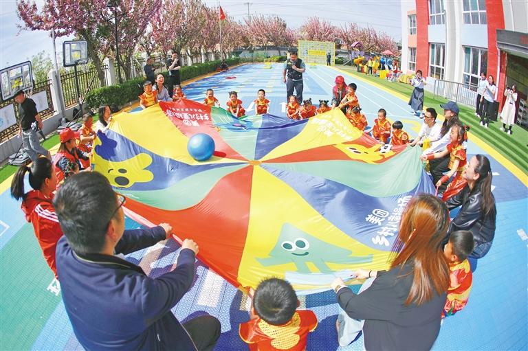 4月15日,小丘镇中心幼儿园的孩子和老师、家长在新操场上做游戏。