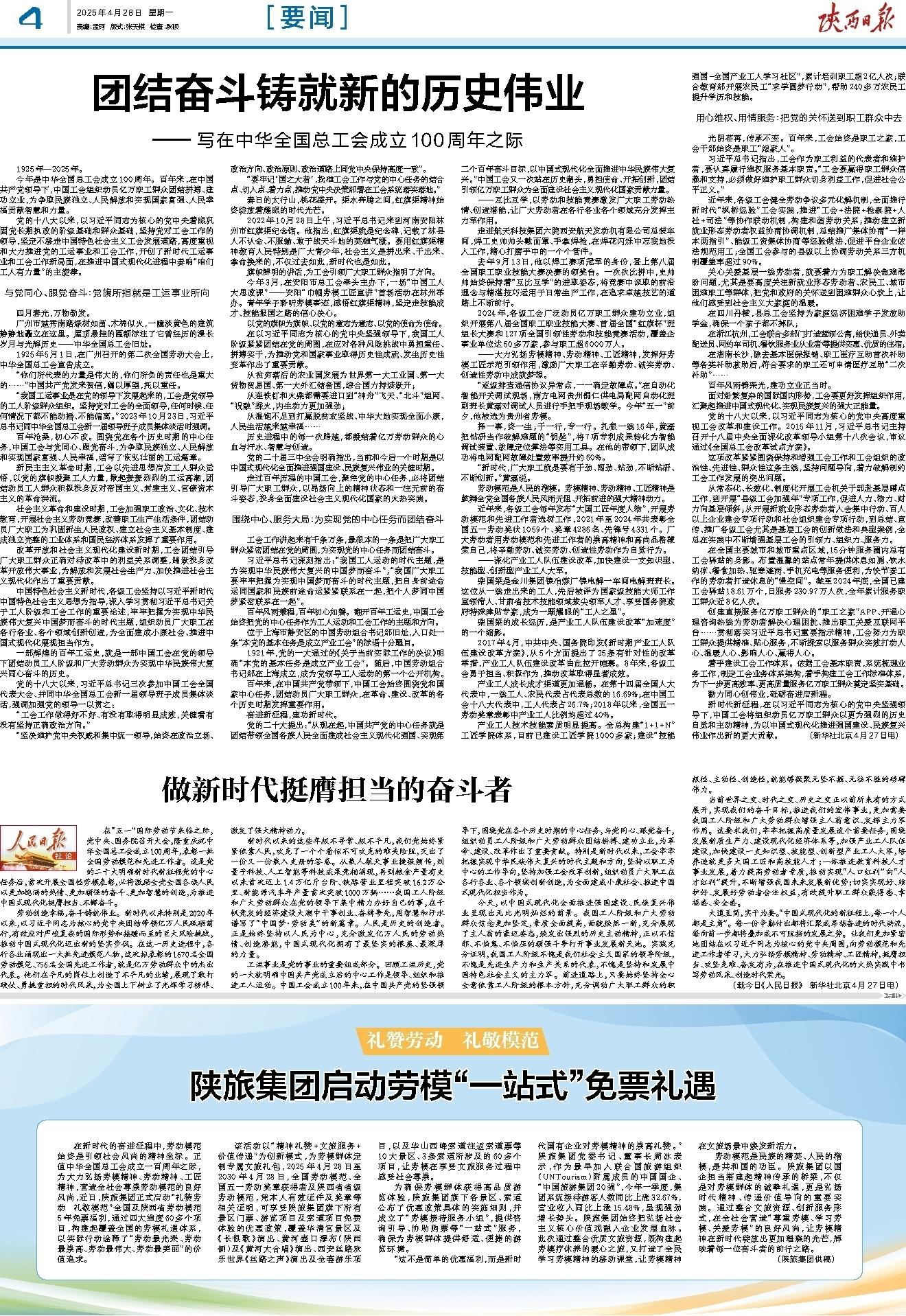 在新时代的奋进征程中,劳动模范始终是引领社会风尚的精神坐标。正值中华全国总工会成立一百周年之际,为大力弘扬劳模精神、劳动精神、工匠精神,营造全社会尊崇劳动模范的良好风尚,近日,陕旅集团正式启动“礼赞劳动 礼敬模范”全国及陕西省劳动模范5年免票福利,通过四大维度60多个项目,构建起覆盖全国的劳模礼遇体系,以实际行动诠释了“劳动最光荣、劳动最崇高、劳动最伟大、劳动最美丽”的价值追求。