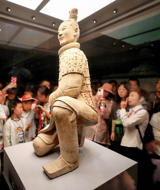 5月1日,游客在秦始皇兵马俑博物馆观赏跪射俑。 本报记者 许奥博摄