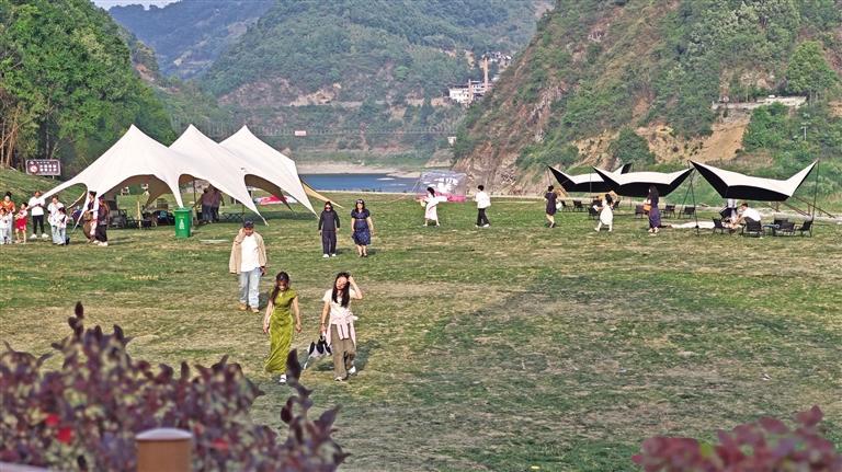 5月4日,各地游客来到安康市紫阳县陕甘茶马古道景区打卡游玩。图为游客在草坪上露营。 本报通讯员 储茂银摄