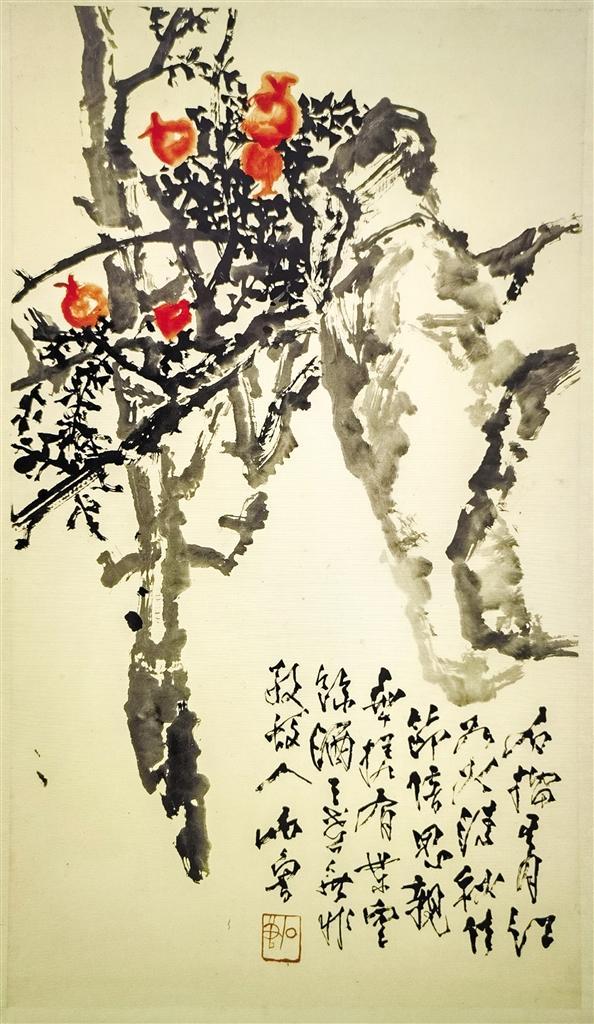 石鲁创作过多幅以石榴为主题的画作,从中可以看出其大写意画风的变化。他在1972年创作的《石榴五月红如火》是一幅融诗、书、画、印为一体的精品,题诗为“石榴五月红如火,清秋佳节倍思亲。无槎有叶空余酒,三盏无非敬故人”。目前收藏在中国美术馆。作品以书入画,书法朴厚灵动、简洁磊落,具有强烈的金石感。画面疏密得当,黑红、枯湿对比强烈。