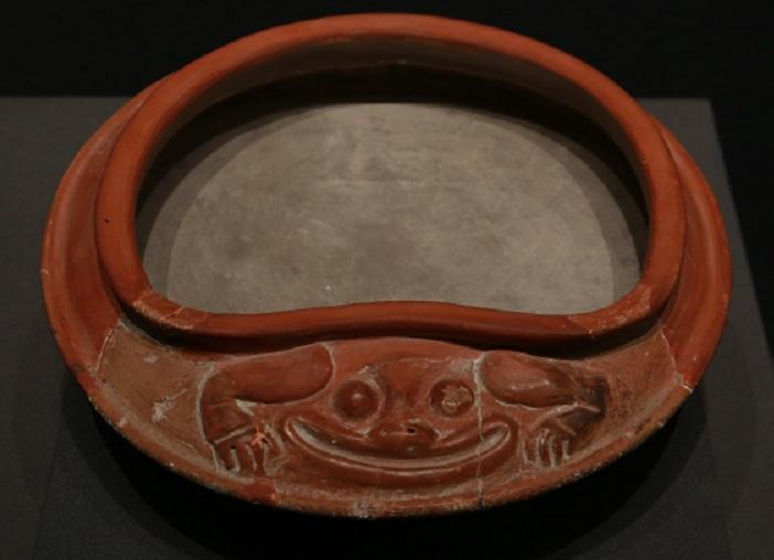 在陕西考古博物馆展出的浮雕蛙纹陶釜出土于陕西省西安市高陵区杨官寨遗址,是仰韶中期的炊具。