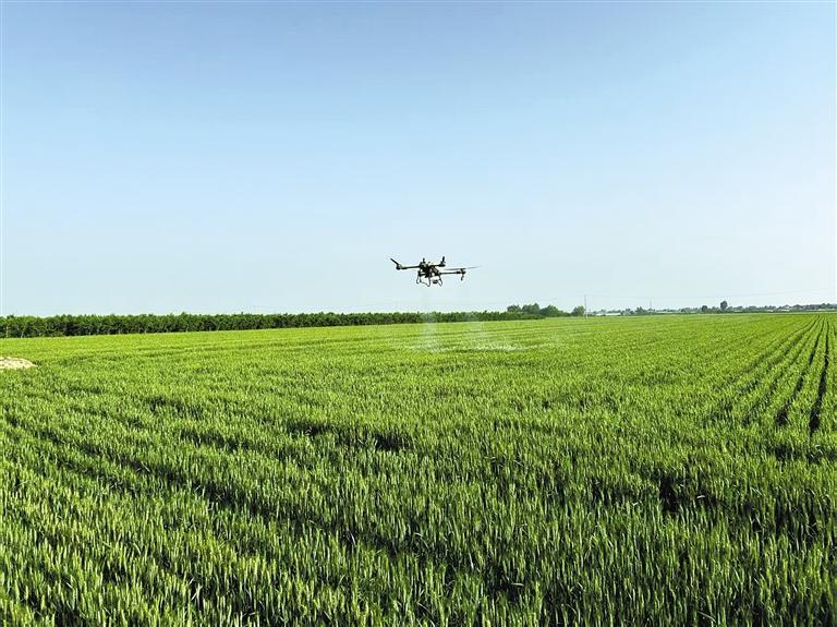 4月25日,在大荔县朝邑镇霸一村,大荔县荔盛农机服务专业合作社的作业服务队通过植保无人机进行小麦“一喷三防”作业。