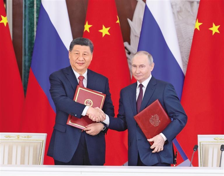 两国元首共同见证中俄双方交换20多份双边合作文本,涵盖全球战略稳定、维护国际法权威、生物安全、投资保护、数字经济、检疫、电影合作等领域。