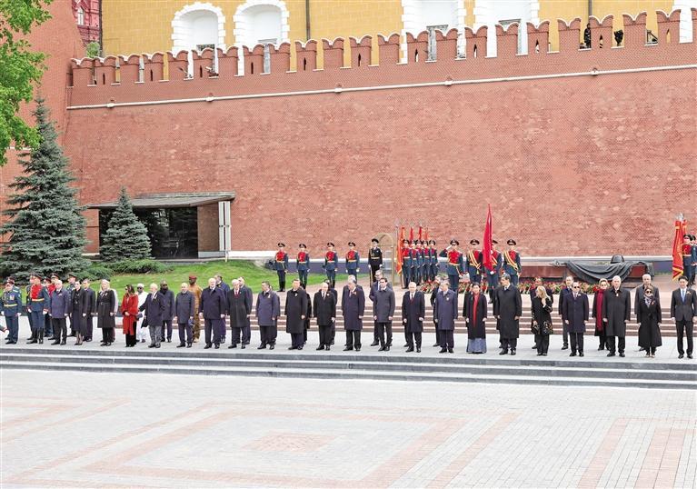 庆典结束后,习近平同其他国家领导人一起从红场来到亚历山大花园,向无名烈士墓献花,并肃立默哀。随后,各国领导人集体合影留念。