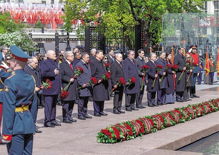 当地时间5月9日,俄罗斯举行盛大庆典,纪念苏联伟大卫国战争胜利80周年。国家主席习近平和来自世界20多个国家及国际组织领导人应邀出席庆典。庆典结束后,习近平同其他国家领导人一起从红场来到亚历山大花园,向无名烈士墓献花,并肃立默哀。 新华社记者 翟健岚摄