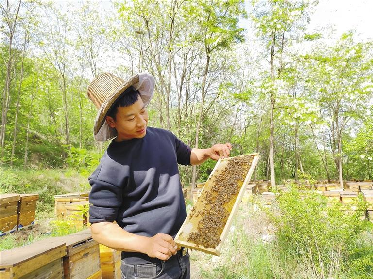 近日,永寿县40万亩槐花次第绽放,吸引了众多养蜂人。图为4月30日,四川泸州蜂农陈光明在永寿县渠子镇洛安村的槐树林忙碌。 本报通讯员 李建龙摄