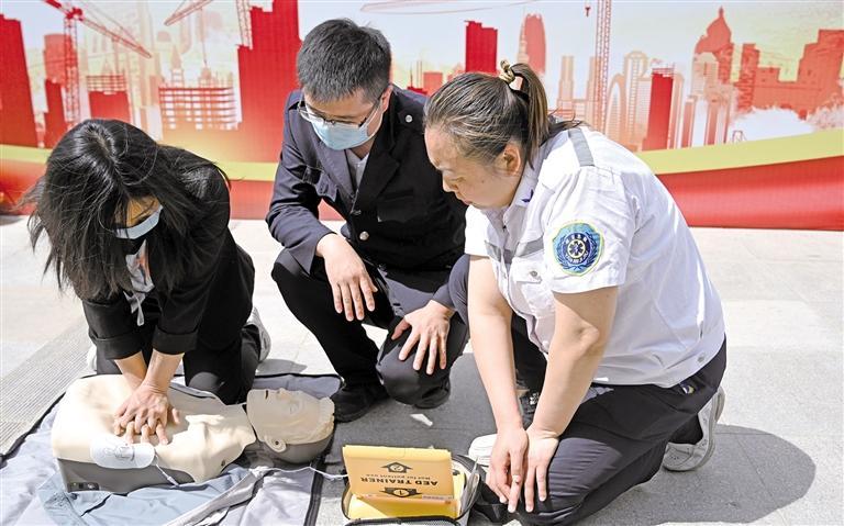 五月十二日,在延安市应急管理局主办的“全国防灾减灾日”宣传活动中,延安市宝塔区人民医院医护人员为群众讲解AED除颤仪的使用方法。 本报通讯员 王德荣摄