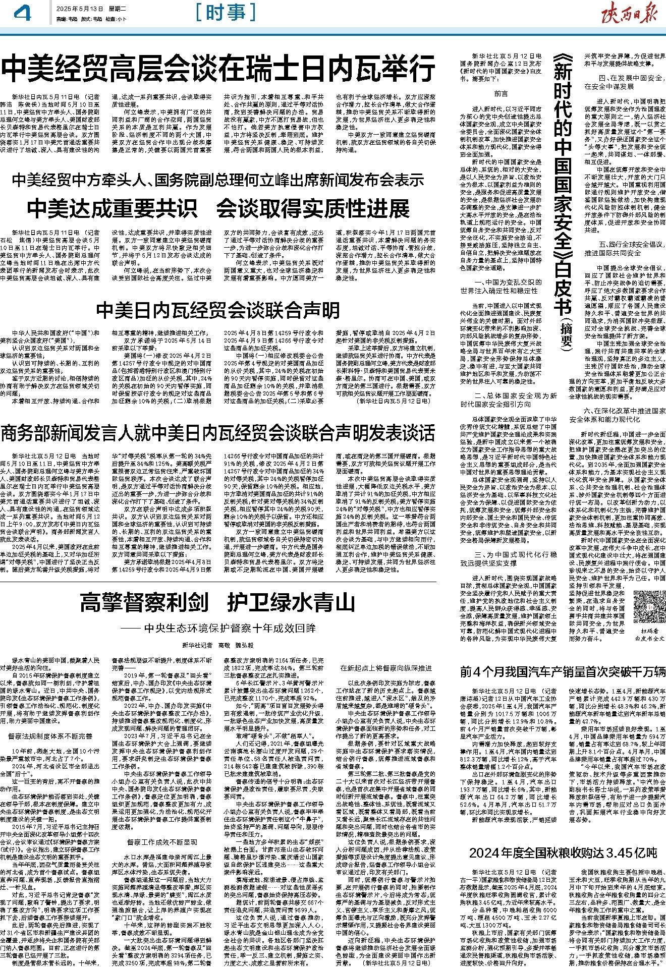 新华社北京5月12日电 当地时间5月10日至11日,中美经贸中方牵头人、国务院副总理何立峰与美方牵头人、美国财政部长贝森特和贸易代表格里尔在瑞士日内瓦举行中美经贸高层会谈。双方围绕落实今年1月17日中美元首通话重要共识进行了坦诚、深入、具有建设性的沟通,在经贸领域达成一系列重要共识。当地时间5月12日上午9:00,双方发布《中美日内瓦经贸会谈联合声明》。商务部新闻发言人就此发表谈话。