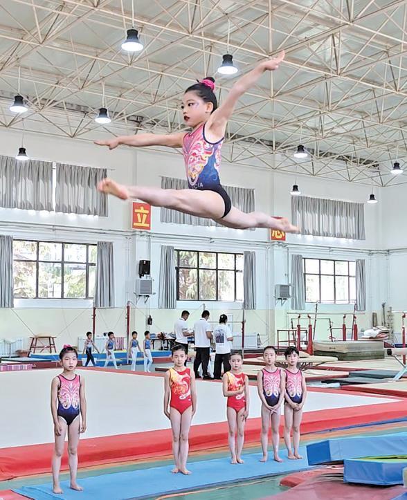 5月10日,宝鸡市第十三届运动会“长安银行杯”青少年体操项目在宝鸡市体育运动学校体操馆开赛。图为运动员在进行蹦床比赛。本报通讯员 崔梦麟摄