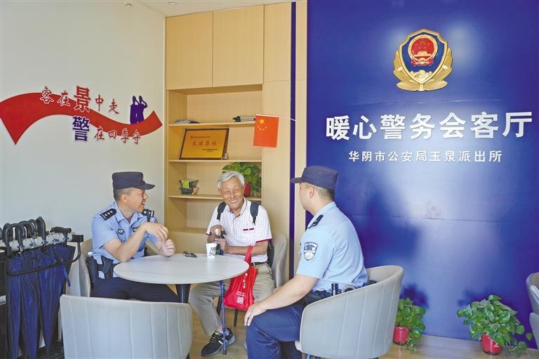 在玉泉派出所暖心警务会客厅,记者看到,充电设施、饮水机、雨衣、急救医药箱等便民物品一应俱全。“华山游客中心是游客的集散地,人流密集、流动量大。为了更好地服务游客,我们在华山游客中心旁设立暖心警务会客厅,实行24小时轮班值守制度。”吴鹏说。