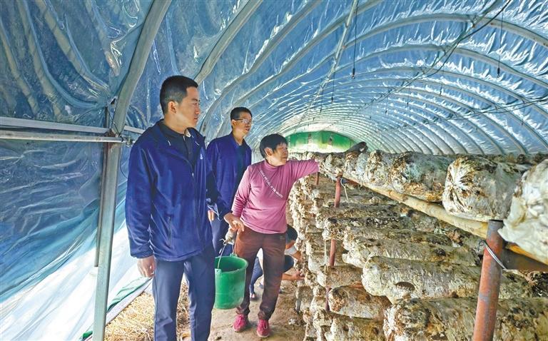 5月15日,李小岗(左)在村集体香菇大棚和种植户交流。 本报记者 王晨曦摄
